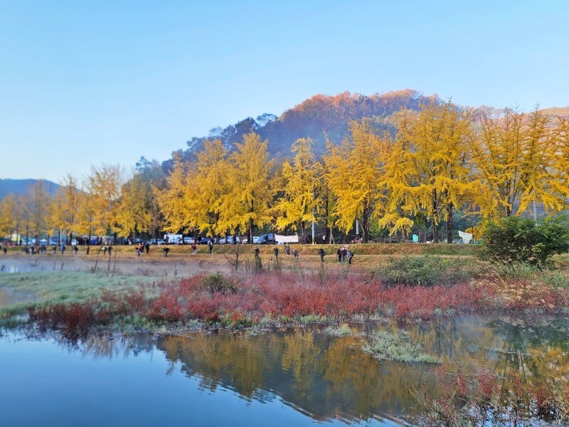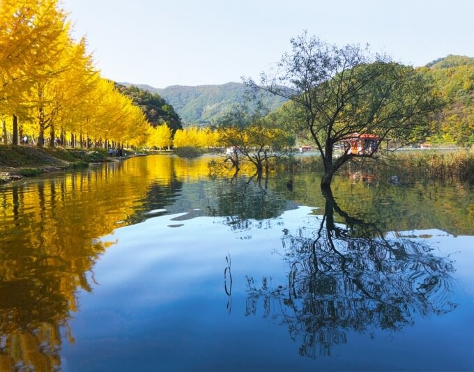 2. 괴산 문광저수지: 은행나무길이 둘러싼 작은 농촌마을